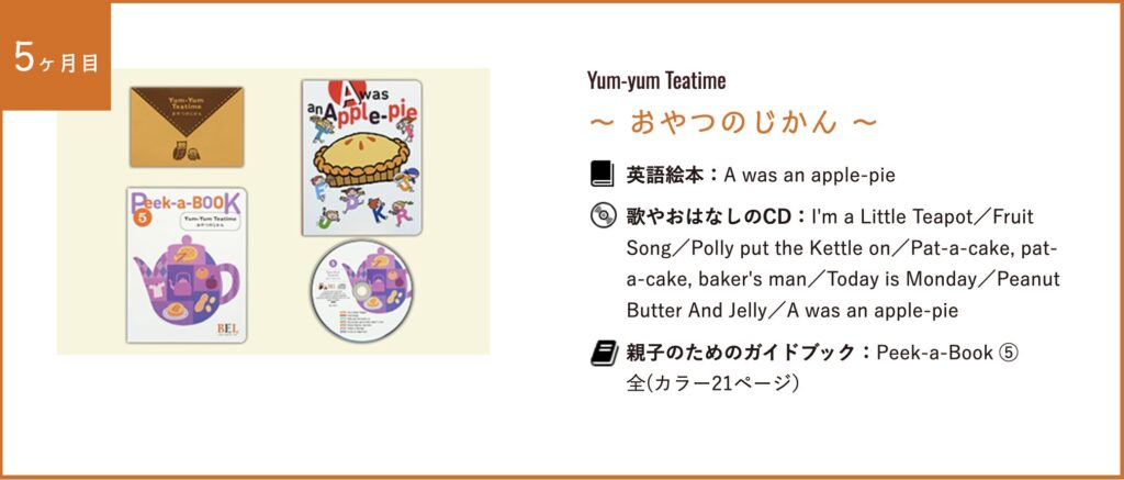 | 5ヶ月目 | A Was an Apple Pie | I’m a Little Teapot/Fruit Song/Polly Put the Kettle On/Pat-a-cake/Today Is Monday/Peanut Butter and Jelly |