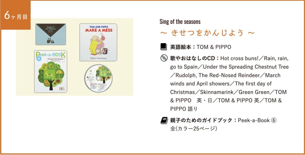 | 6ヶ月目 | 季節を感じる | TOM & PIPPO | 季節や自然をテーマにした英語の歌と物語 |