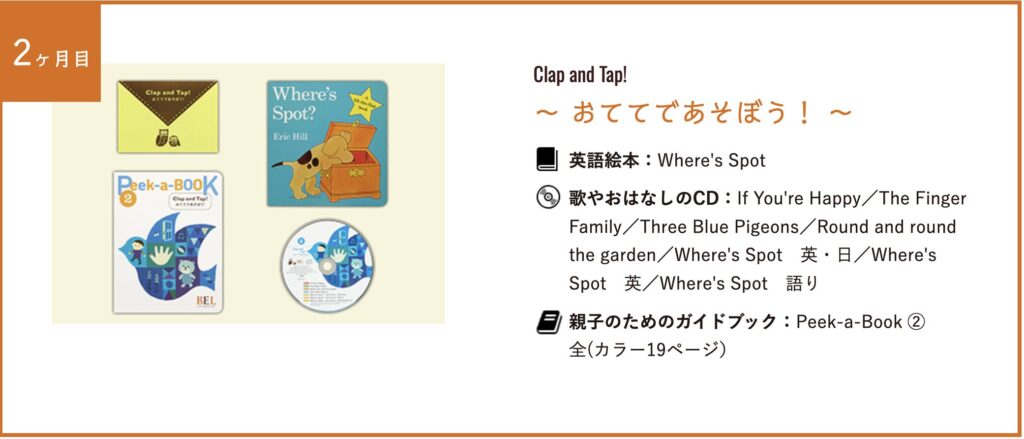 | 2ヶ月目 | Where’s Spot | If You’re Happy/The Finger Family/Three Blue Pigeons/Round and Round the Garden/Where’s Spot(英・日) |