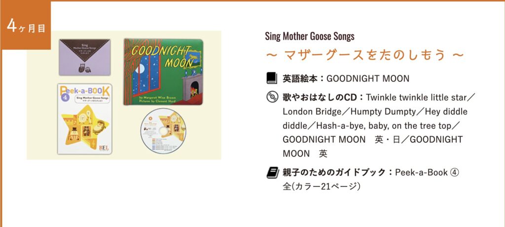 | 4ヶ月目 | GOODNIGHT MOON | Twinkle Twinkle Little Star/London Bridge/Humpty Dumpty/Hey Diddle Diddle/Hush-a-bye Baby/GOODNIGHT MOON |