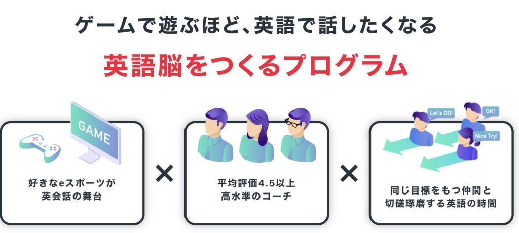 | eスポーツ英会話 | 9,900円 | 80分 | グループ | ゲーム×英語で学べるアウトプット重視型 |