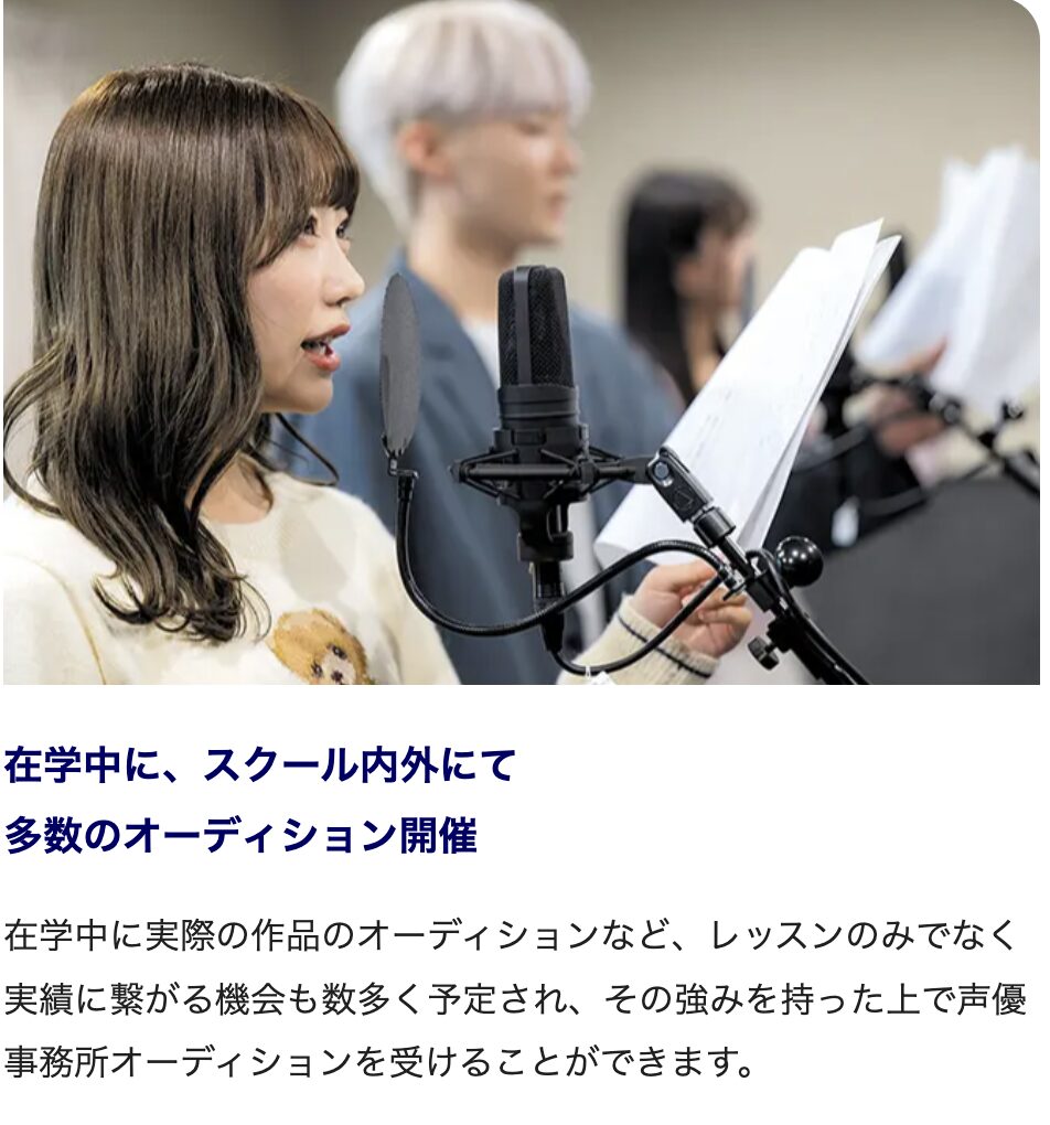 - 在学中からオーディションに挑戦でき、業界と直接つながるチャンスがある
