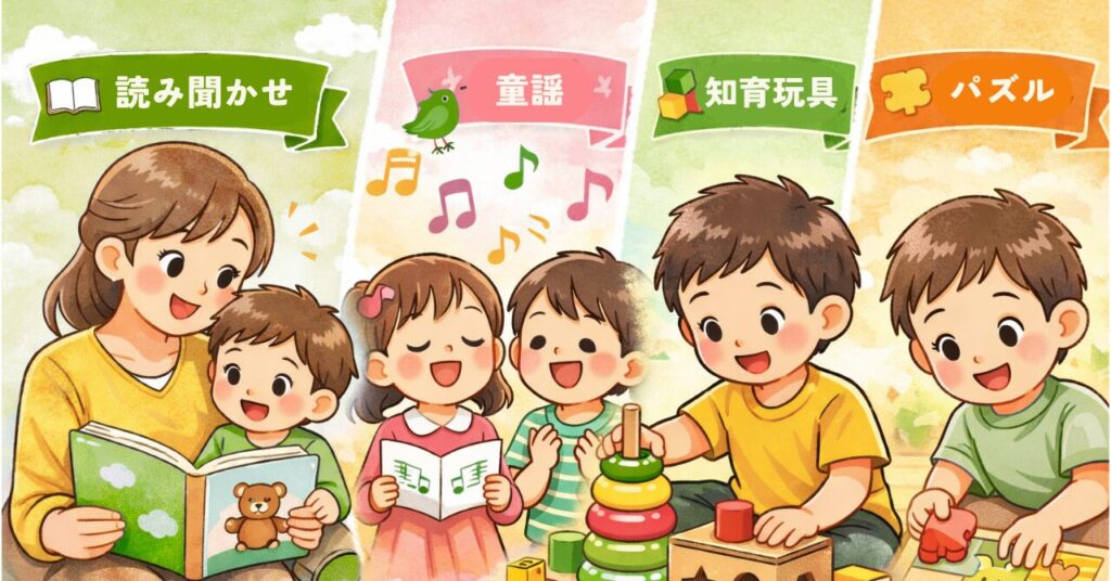 - 読み聞かせ・童謡・知育玩具をバランスよく取り入れることが成長のカギ
