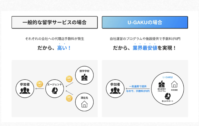 多くの留学エージェントが仲介型である中、U-GAKUは自社運営のため仲介コストを抑え、その分を体験の質に還元しており、「安さ」ではなく納得感のある価格設計と費用の透明性を大切にしています。